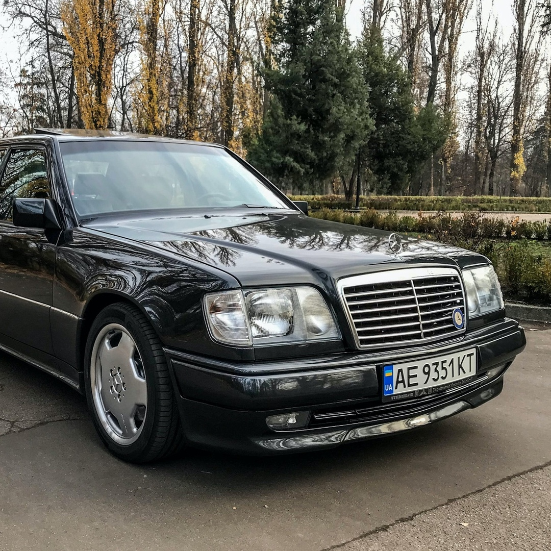 Это Mercedes-Benz E420 в кузове W124. Машина 1994 года выпуска с пробегом в 236 тысяч километров. Весь прошлый год она проходила комплексную реставрацию, целью которой было создание фактически нового 124-го. Седан был разобран до последнего винтика, и работа закипела! Кузов механически очистили от краски до голого металла, подварили проблемные места и заново выкрасили в оригинальный цвет Blauschwarz metallic. Попутно авто укомплектовали фирменным аэродинамическим обвесом AMG. Место стоковых дисков («ромашек») заняли более эффектные моноблоки от AMG с новой резиной. Кстати, на запасном колесе ещё сохранилась оригинальная шина Pirelli P4000, с которой машина сошла с завода. Версия E420 производилась с 1994 по 1996 год и оснащалась могучим V8, который выдаёт 279 л.с. и позволяет седану разгонятся от 0 до 100 км/ч всего за 6,8 секунды. Неплохие показатели даже по нынешним меркам. Так вот, мотор также подвергся реставрации: был сделан капитальный ремонт оригинальными запчастями, заменены вс