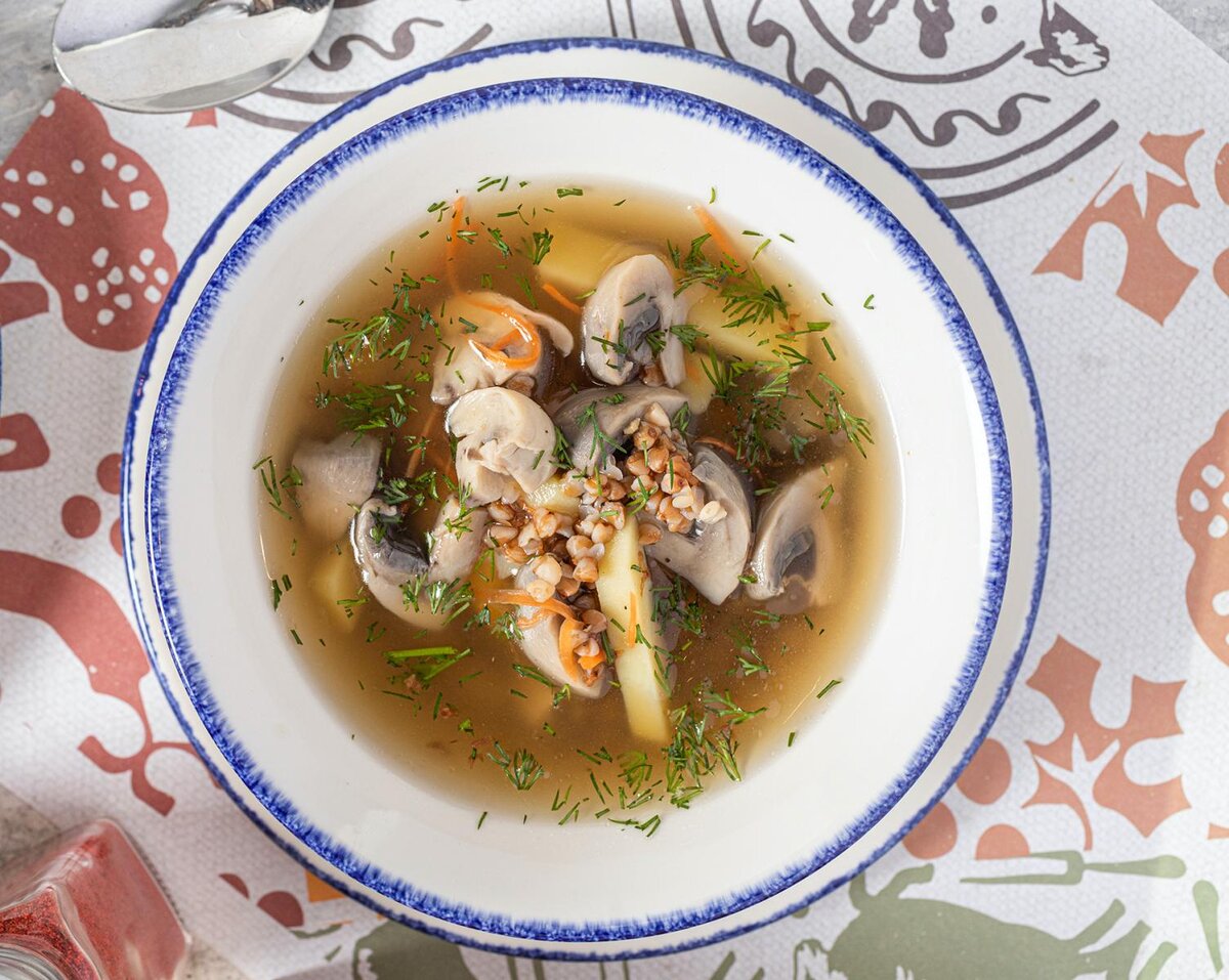 Настали тяжелые времена, а это значит, что пора научиться готовить что-то интересное из, казалось бы, самой простой крупы — гречки. Ниже представлено четыре рецепта с гречкой от шеф-поваров популярных ресторанов. Грибной суп с гречкой Следующий рецепт — грибной суп с гречкой от шеф-повара ресторанов «Джонджоли» Русико Шаматава. Для его приготовления понадобятся: Лук нужно нашинковать, а морковь и картофель нарезать мелкими кубиками. Растительное масло разогревается на сковороде, далее на нее выкладывается лук и обжаривается до золотистого цвета. Следующий шаг — добавить к луку морковь и жарить ее до золотистой корочки. В кастрюлю наливается овощной бульон, после доведения до кипения добавляется картофель. Картофель необходимо варить семь минут, вовремя снимая пену, а также посолив и поперчив. В кастрюлю добавить белые грибы, предварительно нарезанные кубиком, лук и морковь и варить пятнадцать минут. Параллельно стоит сварить гречку и нарезать укроп. Готовый суп выливается в тарелку, в