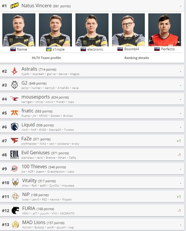 Обновлённый рейтинг топ-30 команд по версии портала HLTV