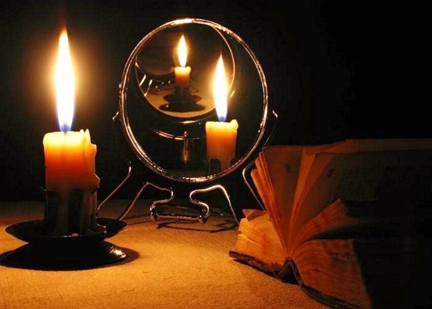 Только в определенное время проводятся самые страшные гадания: на святки, в новогоднюю ночь, на праздник Ивана Купала и на старый Новый год девушкам разрешено заглянуть за завесу тайны и получить ответ на любой вопрос. Страшное гадание на суженого: ужин с женихом Обязательное условие – проводить ритуал только в нежилом помещении. Идеально для этой цели подходят: баня, сарай, заброшенная конюшня. В современных реалиях девушки просто уединяются в комнате, в которой никто никогда не ночует (даже домашние животные). Понадобятся: С наступлением ночи начинают подготовку. Нужно поставить зеркало так, чтобы в нем отражалась дверь (ее обязательно оставляют приоткрытой). По бокам следует расположить свечи и зажечь их. Перед собой необходимо разместить ломти хлеба и бокалы с вином. Сесть требуется в промежутке между зеркалом и дверью. Гадающая должна видеть отражение, но не иметь возможности случайно взглянуть назад. Сосредоточившись, нужно прочесть заговор: «Петухи нынче замолкли, божьи твар