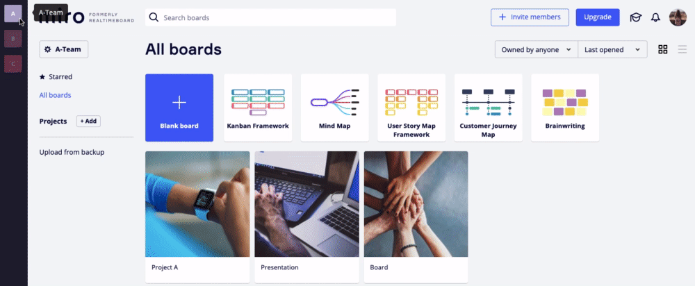 Dashboard is the main Miro page where you can navigate between your accounts, projects and boards. Accounts are your workspaces/teams, and you can have several accounts in your profile. If you are a member or were invited to some of the boards in a team, you will see the team icon on the left sidebar on the Dashboard. Switch between the teams by clicking the square icons on the left-side panel. This user has 3 teams on the dashboard Dashboard interface On the Dashboard, you have quick access to your profile and account settings, projects, boards shared with you in the chosen account and ★starred boards in your whole profile. Here you can create a new board, search through existing boards, upload backup files, sort and organize your boards in the way which is convenient for you. In this article: 1. Profile settings
