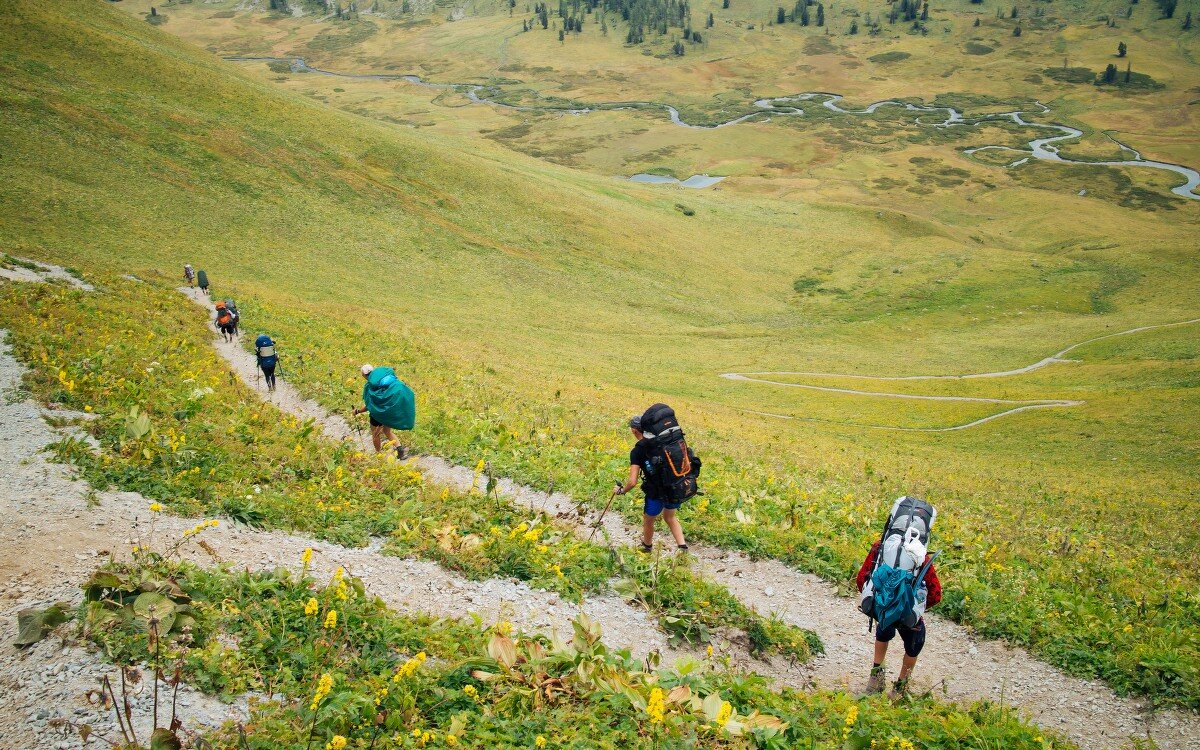 Весёлый привал закончился и мы начали спуск к реке. Хотелось скорее дойти до реки и наконец то заморить червяка. Извилистая тропа представляла натоптанную дорожку похожую на обычный грейдер, ботинки скользили по мелким камешкам и приходилось постоянно себя тормозить палками, что бы не превратиться в кувыркающийся мешок картошки. Мне такой спуск давался с трудом, хотя некоторым личностям нашей команды удавалось двигаться довольно шустро. Когда скоростной серпантин закончился и тропа выровнялась, оказалось что до реки нужно пройти еще довольно приличное расстояние. Наконец то дошли до Тихой речки, течение тут слабое поэтому можно спокойно перейти реку в тапках, что в принципе мы и сделали. Скидываем рюкзаки и падаем рядом, мышцы и колени болят после затяжного длинного спуска, хочется просто повалятся на траве. На обед сегодня у нас как обычно: шпроты, паштет, грудинка с запашком и орехи с печенюшками. Пока уплетали бутерброды с перевала спустились два ковбоя на лошадях. Двумя днями