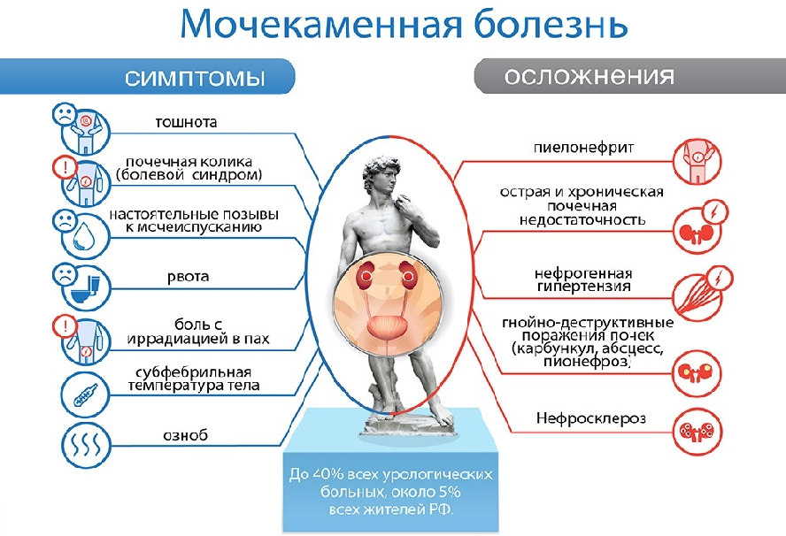 Самая частая причина образования камней — недостаточный объем мочи. Поэтому обильное питье — важнейшая часть профилактики рецидивов мочекаменной болезни. Жалобы Камень может вызвать острую обструкцию (закупорку) мочевых путей с классической картиной почечной колики: схваткообразная боль в боку, которая отдает в пах, яичко или половые губы на стороне поражения в сочетании с появлением крови в моче.