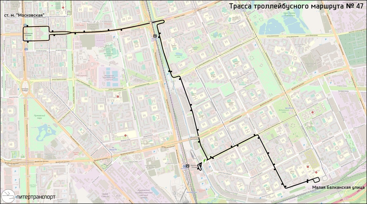 № 47: от к/ст "Малая Балканская улица" по действующей трассе ст. метро "Купчино", далее по Балканской пл., ул. Ярослава Гашека, Малой Балканской ул., ул. Димитрова, Белградской ул., пр. Славы, ул. Типанова, Московской пл. до ст. метро "Московская".