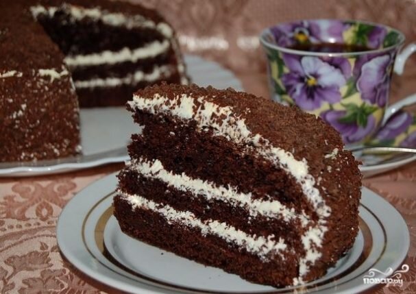 Ингредиенты: Кефир-1 стакан. Варенье из чёрной смородины-1 стакан. Сода-1 ст. ложка. Яйца-2 шт. Мука-2,5 стакана муки. Сахар-1 стакан. Сливки-1 стакан. Приготовление: Смешать кефир с вареньем и содой и оставить на 20 минут. Затем взбить яйца,добавить муку. Замесить тесто, из которого нужно испечь три коржа.Готовые коржи смазать кремом.Крем готовить следующим образом: 1 стакан сливок взбить с 1 стаканом сахара. Приятного аппетита!