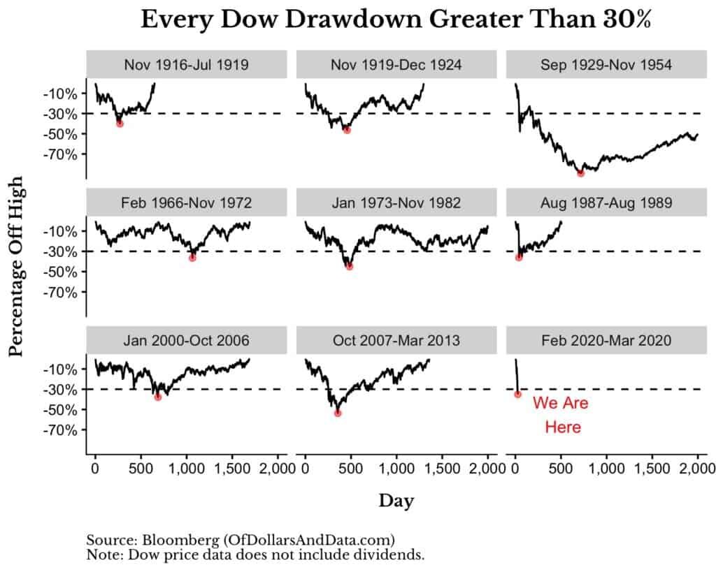 Доу упал на 35%, и март уже станет одним из худших месяцев для фондового рынка США. Если мы посмотрим на каждое падение более чем на 30% с 1915г, то увидим, что текущий обвал является одним из самых быстрых в истории: