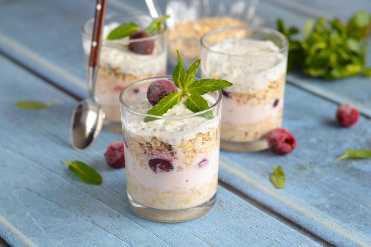 Пусть вас не пугает указанное время приготовления. Ленивая овсянка в банке готовится буквально за пару минут. Остальное время требуется для настаивания и вашего участия не требует. Такой завтрак удобно готовить с вечера. На следующее утро вам достаточно лишь достать из холодильника блюдо и насладиться его вкусом. Ночная овсянка не только вкусная, питательная, но и очень полезная. Если к рецепту подойти творчески, экспериментируя и комбинируя разные добавки, блюдо вам и вашим домашним никогда не надоест. Готовить такой десерт очень удобно, когда спешишь на работу или хочется дольше поспать. Также баночку с овсянкой можно взять с собой на работу и позавтракать там. На заметку. Когда овсянка варится, она теряет много полезных веществ. Холодный способ приготовления сберегает ее ценные свойства, сохраняя все микроэлементы и витамины. Время приготовления 9 часов Калорийность 145 ккал\100 г Ингредиенты (3 порции) · йогурт (120 г натурального и 120 г вишневого) – 240 г; · овсяные хлопья (бы