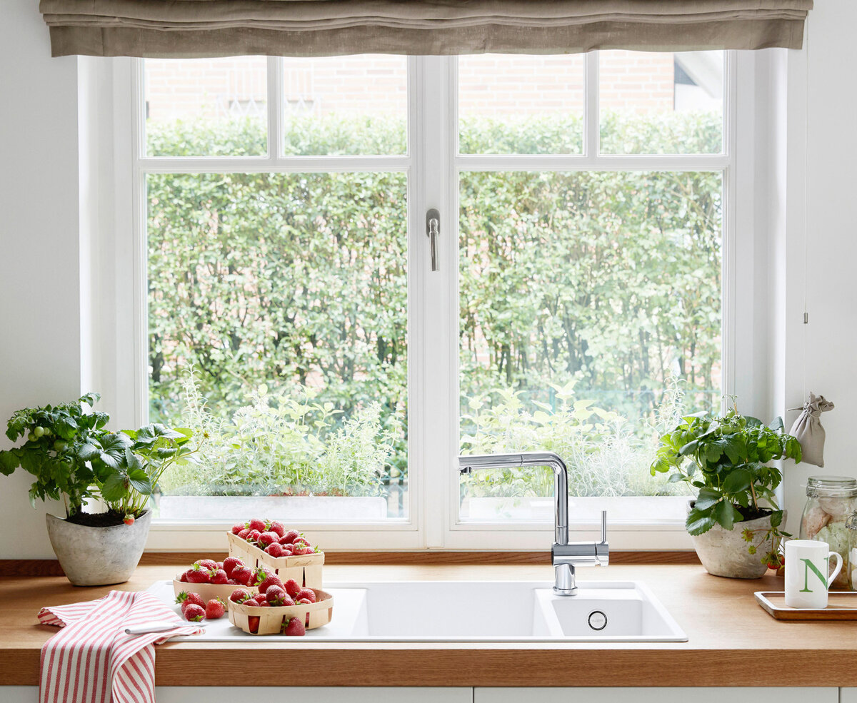 Если вам посчастливилось планировать свою новую кухню в помещение с окном, то у вас есть шанс стать еще счастливее. Используйте одно из самых красивых мест на кухне - перед окном для установки кухонной мойки. Вы проводите от 60 до 70 процентов своего времени на кухне у мойки. Очистить, нарезать, помыть, смыть, промыть - все это можно делать, наслаждаясь видом на улицу. Если принято решение установить кухонную мойку перед окном, правильное планирование и выбор смесителя - самая большая проблема. Почти всегда окна открываются во внутрь. Обычный смеситель будет просто мешать открыть окно. Грамотным решением является выбор смесителя, который можно снять, опустить или сложить. Если вы ищете особенно элегантное и функциональное решение, то вам может подойти выдвижной смеситель. Интересные факты о выдвижных смесителях: - особая фишка таких смесителей - они полностью функциональны в любом положении. - такие смесители имеют отдельный элемент управления, с помощью которого можно включать и выкл