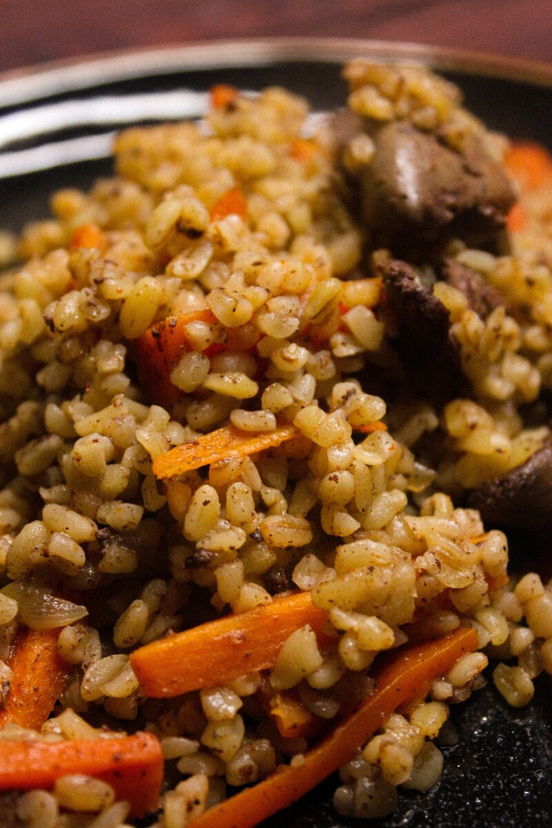 Сейчас будет вкусно Представляю вашего вниманию достаточно простое блюдо, но вышло оно очень вкусным. Мой inst: nastya.chili Кстати, я думаю, его можно считать вполне себе пп. Особенно, если сократить количество масла до минимума. Мне кажется, это рецепт достоен сохранения) Берём: • 250г булгура • 500 мл кипятка • 400г печени • 1 морковь (~ 100г), нарезать полосками • 1 луковицу (~ 60г), мелко нарезать • масло для жарки • 1 ч.л. молотой паприки • 1/4 ч.л. молотого чили • 1 ч.л. чёрного молотого перца • 2-3 головки чеснока • 1 ч.л. соли • масло для жарки Готовим: 1. Лук и морковку пассеровать 4-5 минут. 2. Добавить все специи с чесноком, очень хорошо перемешать. Пассеровать еще 3-4 минуты. 3. Всыпать булгур и обжарить в течение 3-4 минут вместе с овощами. 4. Влить кипяток, немного перемешать и накрыть крышкой. Томить на небольшом огне 15 минут. 5. В это время обжариваем печень в течение 5-7 минут. 6. Выложить печень к булгуру, накрыть крышкой и оставить томиться еще