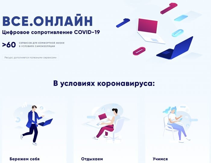 Правительство России запустило сайт «Все.онлайн» (или vseonline.online) для граждан, которые находятся на карантине из-за вспышки Covid-19. Через него можно заказать еду, получить медицинские консультации, обучиться или развлечься фильмами. В частности, через специализированные порталы можно выйти на сервисы телемедицины, подборки фильмов и сериалов, развлекательные онлайн-платформы крупнейших операторов связи, услуги такси и каршэринга. Имеется доступ к сервисам для учащихся, аудиокнигам из школьной программы по литературе и внеклассному чтению. Так же Почта России предоставила для проекта сервис бесконтактной доставки посылок до двери и другие услуги, которые могут понадобиться самоизолированным гражданам.