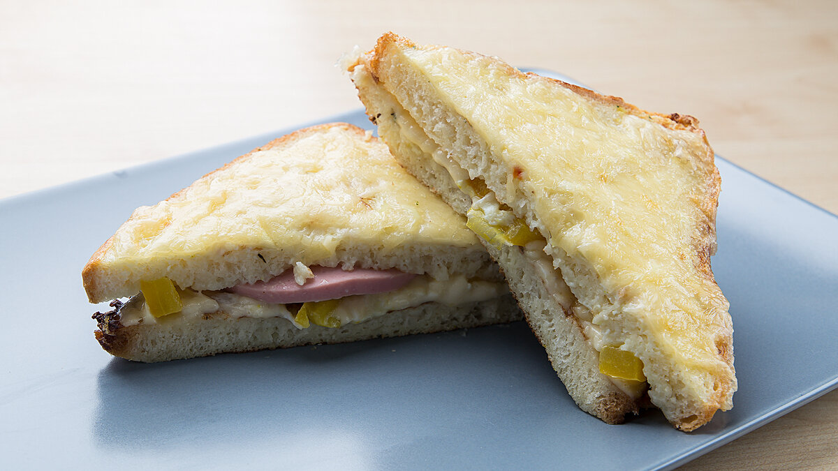 Надоели обычные бутерброды? Предлагаю приготовить очень вкусный, сытный, простой в приготовлении сэндвич для большой семьи или компании Нам понадобится: Хлеб - 1 уп. Ветчина или колбаса - 300 гр Сыр - 150 гр Перец болгарский - 1 шт. Яйца - 5 шт. Молоко - 150 мл Соль Перец Французские травы Способ приготовления: 1. В яйца добавляем соль, перец, французские травы и молоко. Все хорошо перемешиваем 2. Обваливаем хлеб в молоке и обжариваем на сковороде с двух сторон 3. Выкладываем обжаренный хлеб в форму для запекания, сверху кладем ломтики сыра 4. Болгарский перец нарезаем небольшими кубиками и выкладываем сверху на сыр, затем кладем ветчину (или колбасу) накрываем все еще одним ломтиком хлеба 5. Поливаем наши сэнвичи оставшейся яичной смесью, посыпаем сыром и выпекаем в заранее разогретой духовке 10-15 минут при 180° ПРИЯТНОГО АППЕТИТА! Подробный рецепт приготовления можно посмотреть в видео: Еще больше вкусных, простых рецептов на каждый день или на праздничный стол вы найдете