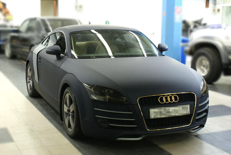 Окрашивание матовой автомобильной эмалью Из всех представленных способов покраска эмалью дает самый хороший и качественный результат. Но стоимость применяемых материалов дороже, чем при покраске глянцевого цвета. Если на кузове появится царапина, то придется перекрашивать весь кузов автомобиля. Так как при полировке царапина дает глянцевый блеск. Применение лака или лака с добавлением присадок, которые придают матовый оттенок Обойдется дешевле, чем покраска кузова автоэмалью. Лак наносится поверх обычной краски. В таком случае машина сохраняет свой первоначальный цвет. Но при возникновении царапины, скола или другого дефекта придется перекрашивать весь кузов транспортного средства. Нанесение на кузов пленки Придание автомобилю привлекательности с помощью виниловой пленки обойдется владельцу дешевле всего. В данном случае не требуется перекрашивать машину полностью и наносить лак. Если поверхность повредится, то достаточно удалить поврежденную пленку и наклеить новую. В случае есл