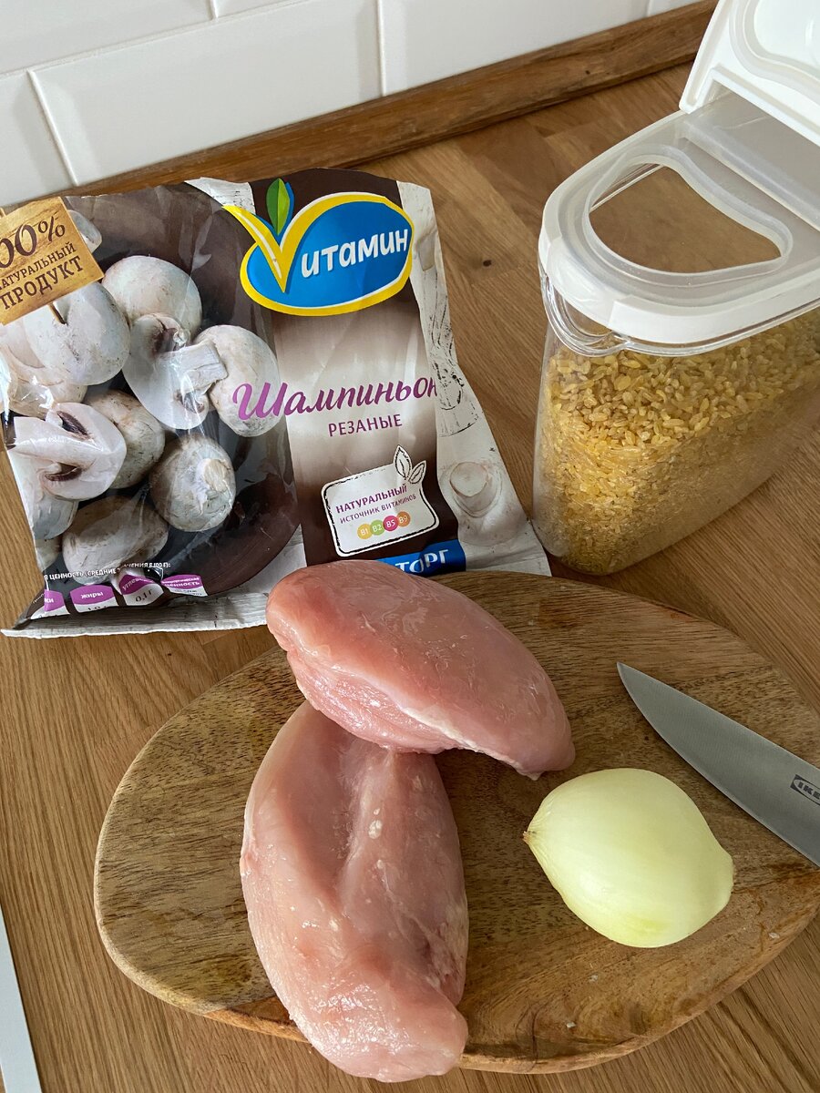 Быстрое вкусное сытное блюдо, напоминающее немного плов. Раньше я его готовила на сковороде, но с появлением мультиварки стало готовить намного проще и наверное даже быстрее) Ингредиенты : Приготовление: 1. Курицу режем произвольно, некрупно. Обжариваем с мелко нарезанным луком на небольшом количестве масла. 2. Когда курица с луком схватились и поменяли цвет, добавляем шампиньоны и любимые специи: 3. Даём немного потушиться, практически до готовности 4. Когда все готово- засыпаем булгуром (можно взять крупы больше, чем 1 стакан, если хочется) 5. Заливаем водой, на 1 палец выше уровня крупы, НЕ ПЕРЕМЕШИВАЕМ, накрываем крышкой и тушим до готовности, пока не испарится вся вода. 6. Я поставила режим «плов» и открыла крышку, когда мультиварка оповестила о готовности☺️ Теперь можно перемешать и подавать на стол Приятного аппетита!