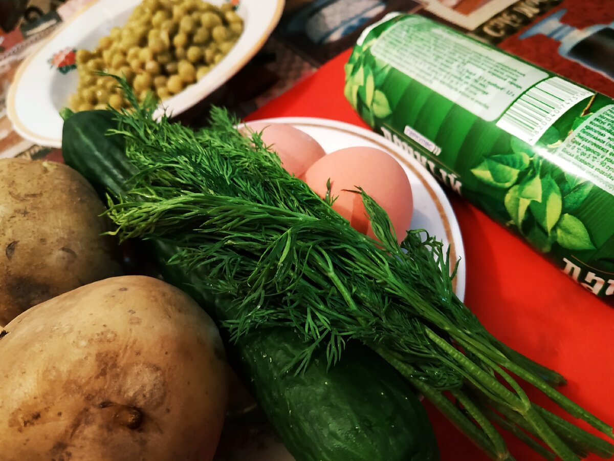 Салатик из доступных продуктов, который очень любят в нашей семье. Готовится быстро и просто. Салатик получается очень легкий, так как все продукты в нем очень хорошо сочетаются между собой, и они всегда есть у Вас в закромах. Картофель и яйца отвариваем до готового состояния, Картофель очищаем от кожуры, а яйца от скорлупы. Огурцы и зелень моем и просушиваем бумажной салфеткой. Баночку с горошком нужно открыть и слить из него рассол, он нам не понадобится. Когда все продукты подготовлены, нарезаем их . Мелкими кубиками режим картофель и помещаем его в глубокую емкость. Также поступаем с яйцами, они тоже нарезаются мелко. Нарезанные яйца отправляем к картофелю. Следующий ингредиент - огурцы, их также нужно порезать кубиками. Отправляем их в салатник к другим ингредиентам. Горошек всыпаем следом за огурцами. Его можно добавлять не весь, так как это на любителя. Зелень мелко рубим ножом. И отправляем в емкость к овощам. Когда все составляющие порезаны, мы беремся за приготовление