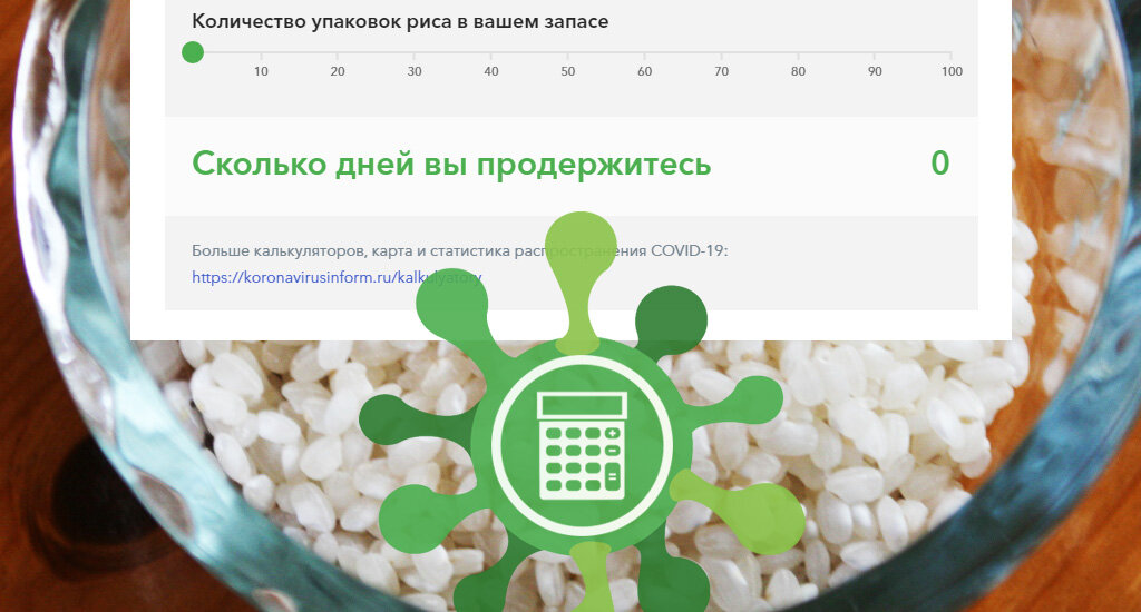 Многие уже слышали про шуточный британский калькулятор туалетной бумаги. Согласитесь, полезная штука на случай карантина из-за коронавируса COVID-19. Дело пошло дальше. На сайте koronavirusinfo.ru появился калькулятор риса. С помощью него можно узнать, на сколько дней вам хватит запасов. Для расчета нужно просто выбрать: число человек, порции (хотя, там они уже выставлены), число приемов пищи, объем и количество пачек риса. И вы увидите, сколько дней вы продержитесь на своем запасе. Кстати, на этом же сайте есть еще 9 других калькуляторов: гречка, тушенка, макароны, медицинские маски, туалетная бумага, антисептический гель для рук, влажные салфетки, жидкое мыло, кусковое мыло. Ссылка на онлайн-калькулятор риса: https://koronavirusinform.ru/kalkulyatory/ris/
