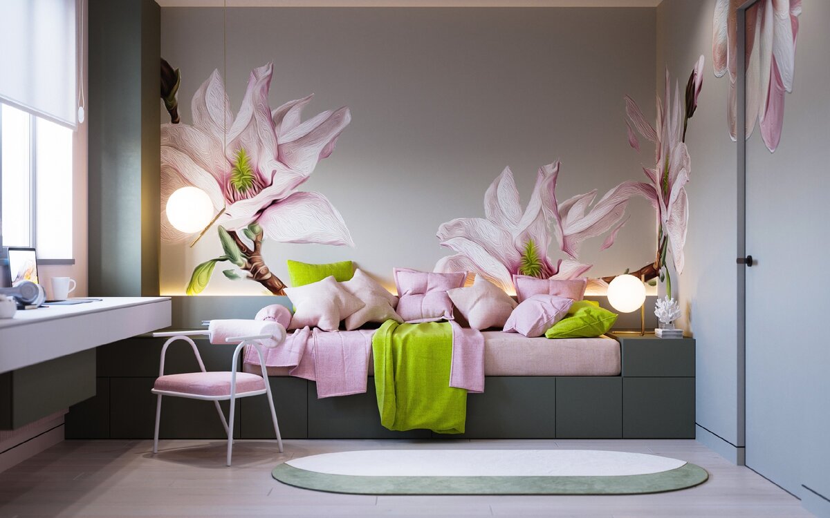 Роспись — креативный и оригинальный способ освежить интерьер. Цветочные мотивы в интерьер уже давно завоевали свое место. На смену привычным обоям «в цветочек» и классическим картинам с изображением цветов пришли более смелые и оригинальные решения. Теперь роспись из цветов может смело покрывать всю стену и даже переходить на потолок. Вместо картин маслом вполне подойдут крупноформатные постеры или фотографии с флористической тематикой. Совсем необязательно во всем интерьере использовать одинаковые приёмы. Намного гармоничнее это решение будет смотреться, если вы будете использовать разные методы, объединенные общим стилем и цветовой гаммой. Как, например, мы сделали с нашем новом проект квартиры в Москве. Suite n.7