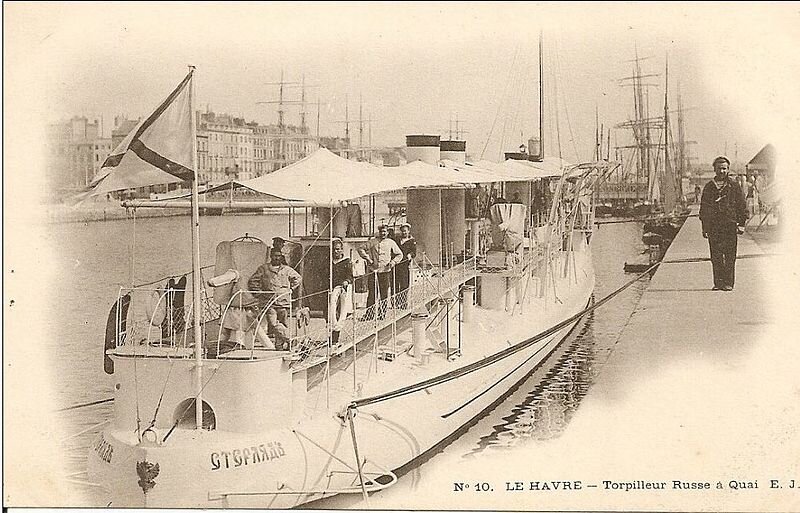 Создание русского миноносного флота произошло в период русско-турецкой войны 1877-1878 годов,когда маленькие русские паровые катера начали топить турецкие броненосцы и пароходы шестовыми и самодвижущимися минами( первый в мире утопленник от торпеды-на счету русских моряков-черноморцев). После первого опыта с миноносцем "Взрыв",командование русского флота решило опираться на зарубежный опыт. Заказывали миноноски в Англии,Франции,а потом и в Германии.Французам,по причине весьма дружественных финансовых и военно-политических отношений,доставался всегда достаточно весомый кусок русских судостроительных заказов. Хотя ,надо признать,строили французы хорошо,быстро и на мировом уровне.