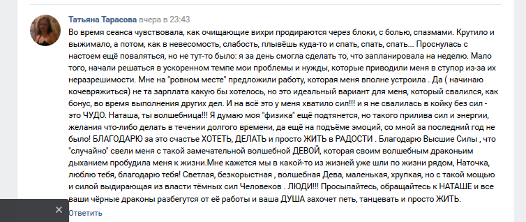 Ниже, один из отзывов о моей сеансе очистки. Чтобы физическое тело стало здоровым, ибо закрытые чакры не дают телу достаточно энергии в местах блоков, и тело заболевает изнутри. Закрытая, сердечная чакра – инфаркт и тахикардия. Закрытая оранжевая чакра – миомы, метастазы, постоянное напряжение. Закрытая горловая чакра – невозможность говорить о том, что ты чувствуешь, жизнь во лжи, болезни горла и лёгких. Закрытая ин