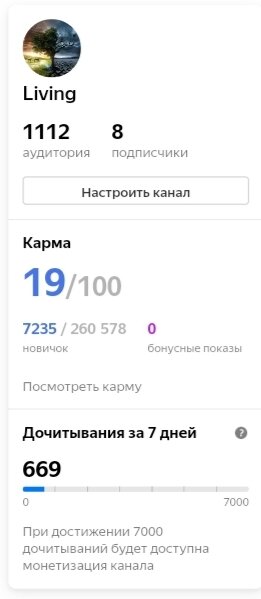 24 февраля я начала вести свой канал под названием Living. Основная тематика это отношения. Между влюблёнными, супругами, разведенными, родителями и детьми, друзьями и коллегами. За месяц я успела написать только 21 статью и 3 нарратива. К сожалению времени не хватает, некоторые пишут и по 5 статей в день, совмещая с работой и домашними делами, я не успеваю иногда и одну написать. Не знаю как они это делают, может по ночам строчат. Вообщем каких результатов я добилась: Спустя 2 недели : 14 статей Спустя месяц: 21 статья и 3 нарратива Какие выводы я сделала: Аудитория добавляется каждый день около 300 человек. Это мне нравится. Хотя я не понимаю от чего это зависит. Кто знает?подскажите. Показов больше тысячи в день не дают, из них в среднем около 300 дочитываний, каждый день, сначала до 1,5 тысяч потихоньку дочитывания росли, но на протяжении уже 2 недели все стоит на месте. Некоторые статьи показали около двухсот раз и больше вобще не показывают. Недавно прочитала ,что лучше пуб