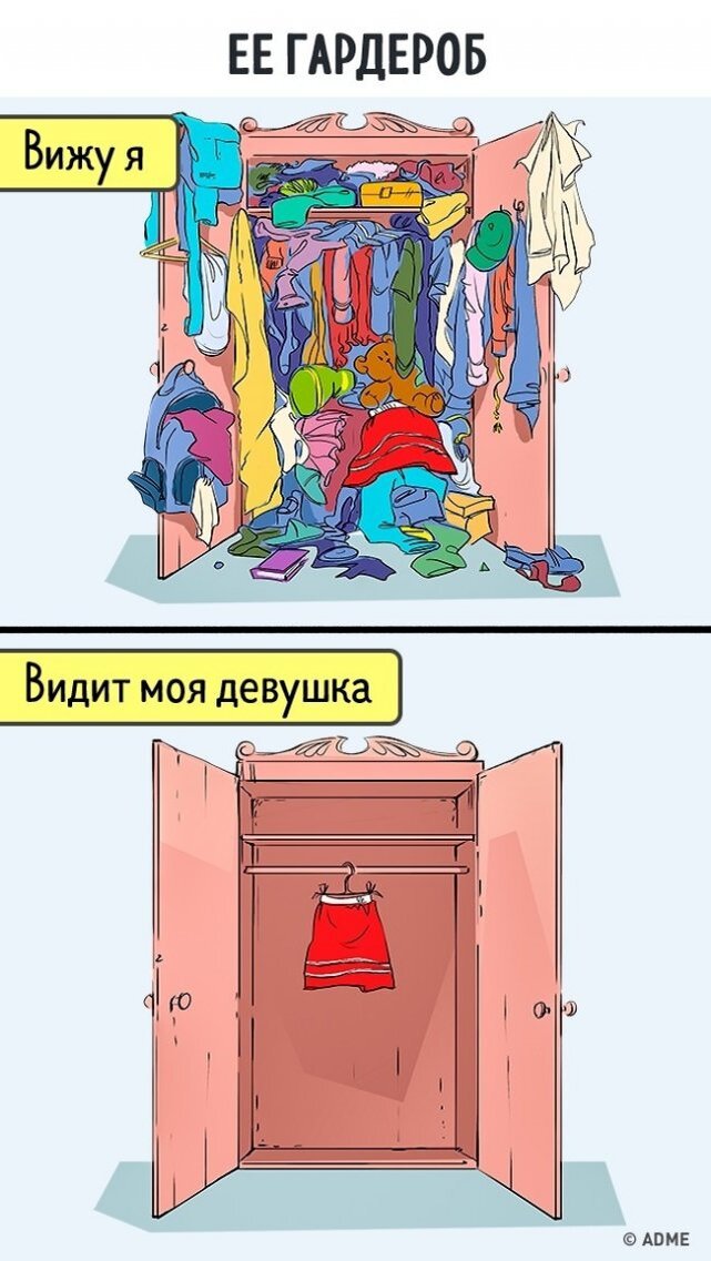 С умным лицом и серьезными намерениями, о разборе гардероба, я написала для вас небольшой обзор. С менее умным выражением лица и задорной улыбкой, составила юмористический обзор, который поднимет вам настроение и настроит на нужный лад, если вы все таки собрались, засучив рукава, привести свой шкаф в порядок. 1. Женский гардероб глазами мужчины. Думаю, я никого не удивлю, заметив, что мужчины видят наш шкаф полным, в то время как мы видим его практически пустым. И ведь не объяснишь же) Еще одна необъяснимая деталь: разнообразный женский гардероб, против однообразного мужского. А ведь их все устраивает. 2. "Мне нечего надеть". Эта фраза уже давно стала родоначальницей шуток, мемов, анекдотов и комиксов. Девочки поймут. Именно с этой фразы и должен начинаться разбор гардероба. Нечего надеть-найдем-разбарахлимся-докупим-станем счастливее А елочка-то, оказывается, нас понимает) 3. А вдруг пригодиться? Любимая отговорки при разборе гардероба) Не пригодиться. Не может вещь лежать года