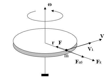 Рассмотрим систему отсчета, связанную с диском, который равномерно вращается с угловой скоростью ω: