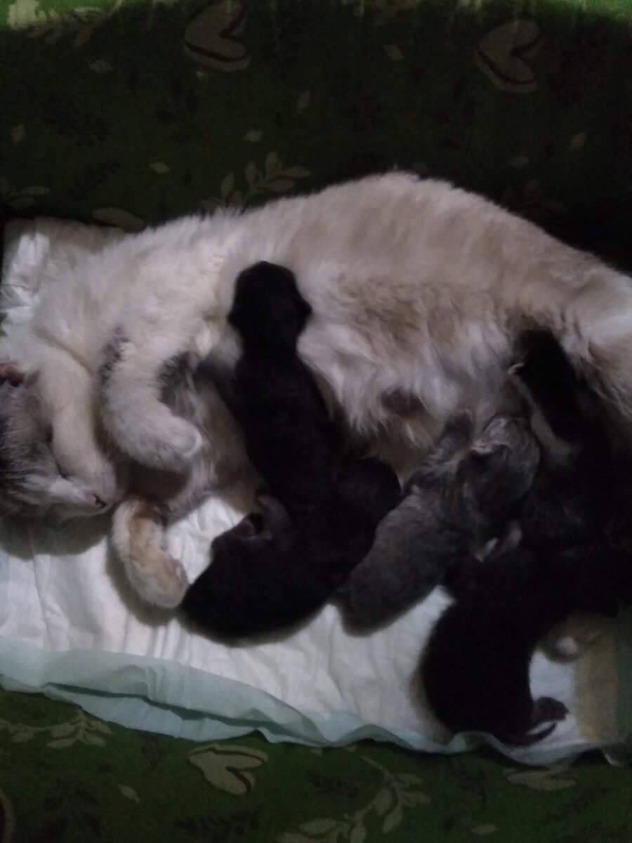 Вот кто без проблем рожает, так это кошки и собаки!!! Свиньи давят, кролики съесть могут, коза бывает не разродится. А кошки и собаки на тебе подарочки, только успевают. Мужа дома не было, а у меня рука не поднялась топить. Вот теперь придется пристраивать. Может быть кому нибудь нужен в подарок маленький хвостик)) Преданный, мурчащий комочек приносящий мышек! Мамочка кстати крысыловка. В прошлом году позвонили в дверь. Открыв калитку я никого не обнаружила. Поняла, когда услышала радостный возглас дочери. Возле ворот стояла маленькая коробка, а в ней теперь уже наше чудо. Пока мы дошли до калитки прошло минуты три. Тот кто подбросил нам котенка успел благополучно скрыться. Вот и выросла наша Маркиза и сама стала мамой правда папа обнаружен не был. Женихов было пруд пруди. Народила она нам 5 малышей. Добро пожаловать за другом)))