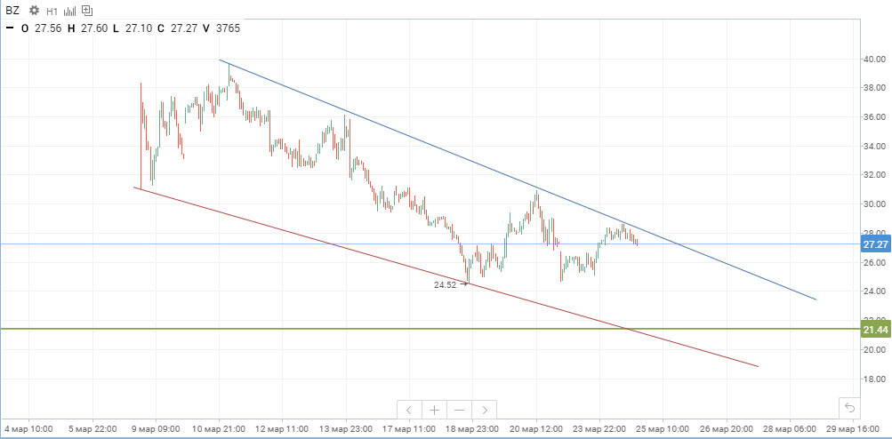 Нефть наше всё. Почему продал акции? Нефть смотрит вниз. И ориентиры у нее первая цель 21,4$ за марку брент, вторая 17$. Нефть ходит в границах нисходящего клина. Сейчас торгуется у верхней границы. Дневная свеча говорит за дальнейшее снижение. По волнам Эллиота две цели. По ходу буду уже определяться. Мой депозит после продажи акций. Плюс 35000 рублей с декабря 2019г. Немного, с учетом девальвации рубля на 30%. Как есть. Удалось определить хай по многим акциям. Потом появился вирус. Сначала была мысль, что вирус запустили для того, чтобы сдуть пузырь на рынке акций. И потом к выборам Президента США в ноябре поднять рынок опять к максимумам. Теперь становится ясно, что с помощью вируса решили обнулить экономику. Обанкротить слабые компании и начать новый экономический цикл. Вирус лишь прикрытие. Сейчас запустят инфляцию и обнулят долги. У того же Китая совокупный долг 303% ВВП. У всех развитых стран гос долги выше 100% ВВП или около того. Похоже настает момент, когда пришло время ск