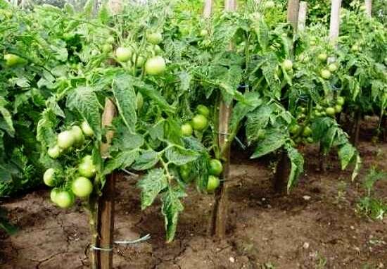 Дней через 10-14 (не раньше) после посадки растения удобряем первый раз. Очень важно в 1-вый раз удобрить их органическим удобрением. Перебродивший коровяк разбавляем водой 1:10, а птичий помёт 1:20. Вначале лунки нужно просто полить, а затем подливать удобрение по 0,5-1 л в лунку. Начинающие желтеть нижние листочки нужно своевременно срывать, а по мере роста кустов удалять и близко расположенные к земле зелёные листья. Недели через три после посадки томаты необходимо пасынковать, отрывать пасынки, вырастающие из пазух листьев, оставляя пеньки длиною 1,5-2 см. С пеньками новые пасынки растут не так быстро. Пасынкование необходимо проводить весь сезон, до окончания сбора урожая.