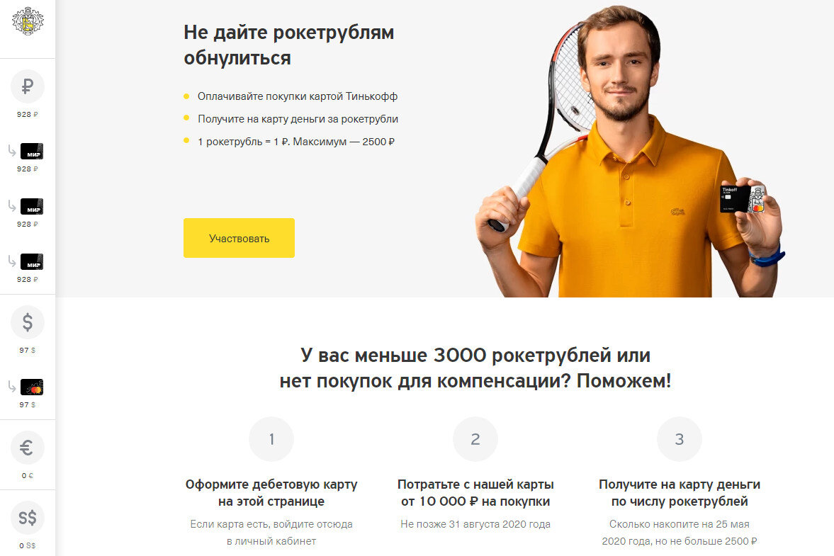 Помимо денег у многих в Рокетбанке остались Рокетрубли. Если их больше 3000, их легко "спасти" через пополнение счёта мобильной связи на сайте оператора (MCC 4814). Если же Рокетрублей меньше 3000, на помощь придёт всё тот же Tinkoff. Если у вас ещё нет карты, её нужно завести, а дальше зарегистроваться по ссылке tinkoff.ru/rocket и потратить по карте Tinkoff не менее 10 000 рублей до 31 августа. Все рокетрубли (но не более 2500) будут возвращены обычными деньгами на счёт карты Tinkoff.