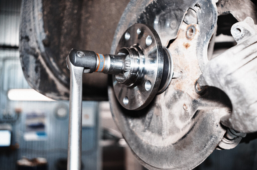 Откручиваем ступичную гайку.Потом снимаем колесо. Окручиваем тормозной супорт два болта и для удобства подвешиваем на проволку к пружине. Далее снимаем тормозной диск.У меня снялся легко и некоторых он прикипает почемуто.Отсоеденяем фишку датчика АБС. Затем откручиваем гайку рулевого наконечника, болт крепления стойки в кулаке, болт с гайкой шарового. Далее выбиваем стойку из кулака.Когда выбивал стойку, рулевой наконечник сам и вылитил из кулака.После выбиваем палец шарового и все поворотный кулак со ступицей снят.Привод слез сразу без каких либо усилий. После выбиваем ступицу.Подбираем подходящую оправкву .Мне помогла большая головка для колесных гаек грузовика.Пару ударов кувалдочкой и готово. После нам нужно снять стопорное кольцо .Но прежде опстукиваем его так как все закисло.Обстучав снимаем его специальными пасатижами.Теперь выбиваем старый подшипник Далее вставляем новый подшипник главное не перепутать ставить нужно к датчику АБС магнитным кольцом оно с одной стор