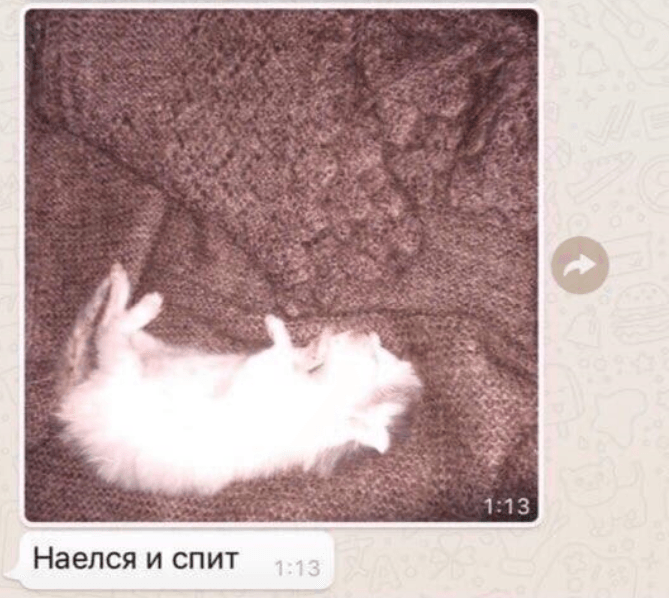 Наелся и спит (Котенок умер) – мем, пародирующий скриншот с перепиской из WhatsApp, в которой мама сообщает о смерти котенка. Происхождение В начале марта 2020 года в рунете распространился скриншот с перепиской из WhatsApp. В переписке чья-то мама прислала две фотографии котенка с комментарием “Наелся и спит”. Но через 8 часов пришло новое сообщение: “Котенок умер”. Картинка стала вирусной, ее запостили десятки пабликов ВКонтакте и в телеграме. А через несколько дней стала мемом. Пользователи стали менять с помощью фотошопа оригинальное фото на скриншоте. Так, вместо котенка в меме оказались Владимир Ленин, Иосиф Сталин и другие давно умершие личности. Значение Мем “Наелся и спит” пародирует оригинальную картинку. Как правило, туда добавляют исторических личностей или знаменитостей, которых давно нет в живых.