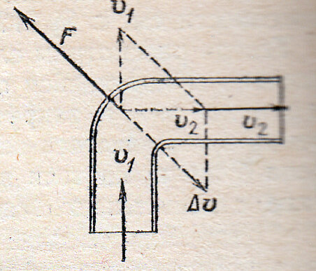 Эта сила действует на движущуюся жидкость со стороны стенки трубки. Согласно второму закону Ньютона, с такой же по модулю силой движущаяся вода действует на трубку, отбрасывая её. Это и есть сила реакции струи воды