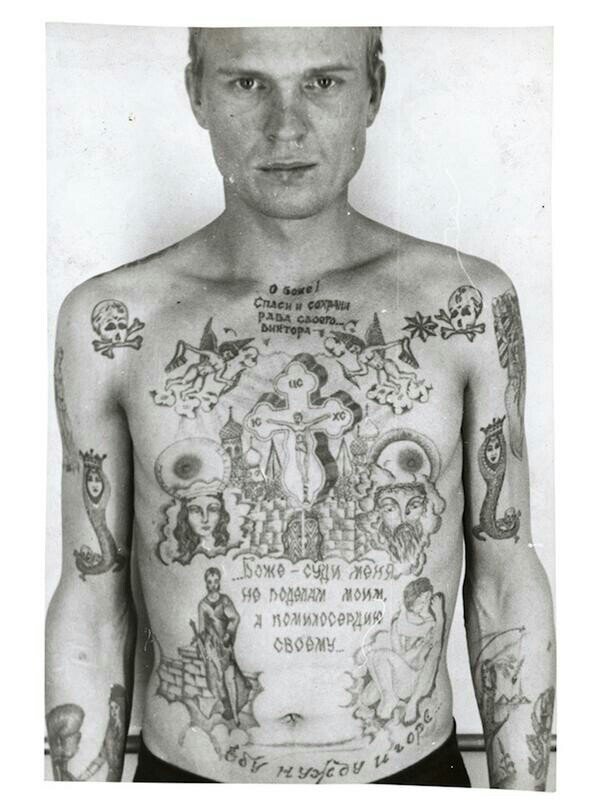 Визуальная энциклопедия российских тюремных татуировок Череп и скрещённые кости на плечах заключенного указывают на то, что он отбывает пожизненный срок. А девочка, цепляющая платье удочкой на левом предплечье - наколка, которую обычно делают насильникам. Кинжал, пропущенный через шею, указывает, что преступник убил кого-то в тюрьме, и готов принимать заказы снова. Капли крови могут означать количество совершённых убийств. Звезды на плечах этого заключенного, указывают, что он является «криминальным авторитетом», а медали служат знаком неповиновения с советским режимом. Глаза на животе указывают на гомосексуальность их обладателя (пенис становится «носом» на изображённом лице). Обвивающая шею змея – знак того, что обладатель татуировки наркозависим. Этот заключённый не авторитет воровского мира, но пытался притвориться им с помощью татуировок, которые должны были повысить его положение в тюремной иерархии. Маяк на правой руке обозначает стремление к свободе. Наручники на каждом зап