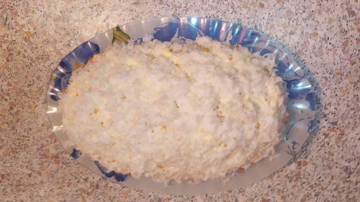 После того как все слои выложены отправляю салат в холодильник на 2-3 часа пропитаться. Салат получается сытный и нежный.