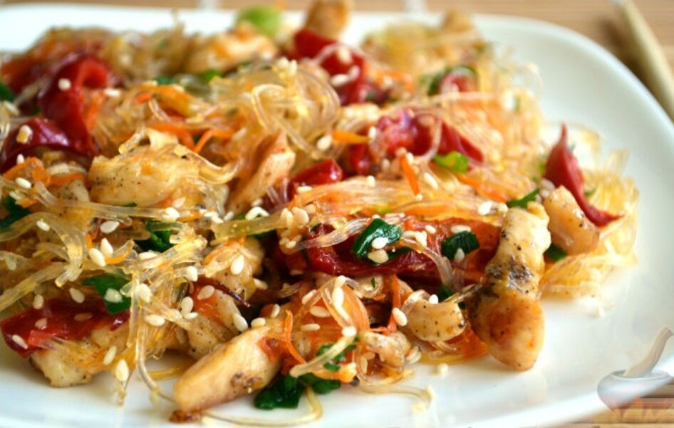 Приготовление: Филе нарезам длинными кусочками. Обжариваем на сильном огне, солим перчим. Лук режем полукольцами и добавляем к курице и обжариваем, до готовности. Стручковую фасоль немного отвариваем в подсоленной воде.Фунчозу приготовить, как указано на упаковке. Залить кипятком и оставить на 7-10 мин. После слить воду и промыть холодной водой. Перец режем соломкой, морковь также нарезаем мелкой соломкой добавляем специи и обжариваем в отдельной сковородке, морковь, перец и фасоль до готовности, в конце добавляем раздавленный чеснок. Смешать в кастрюле, приготовленную курицу с луком, овощи и фунчозу, все заправить рисовым уксусом и соевым соусом, тщательно перемешать и оставляем настояться около часа. Перед подачей посыпать кунжутом. Готово. Приятного аппетита !!!