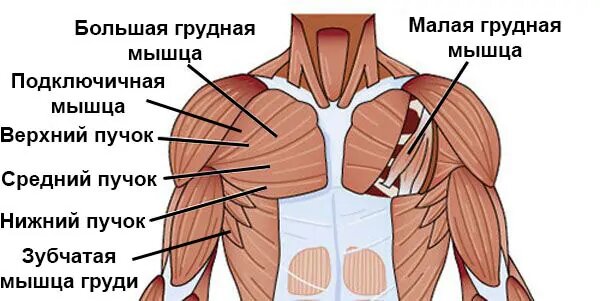 Если учитывать анатомию грудных мышц, большая занимает почти весь объем группы. Строение этой грудной мышцы отличается сложной структурой. Мышечные волокна направлены в разные стороны, потому для проработки всей поверхности необходима нагрузка под разными углами. Большая грудная начинается от:
