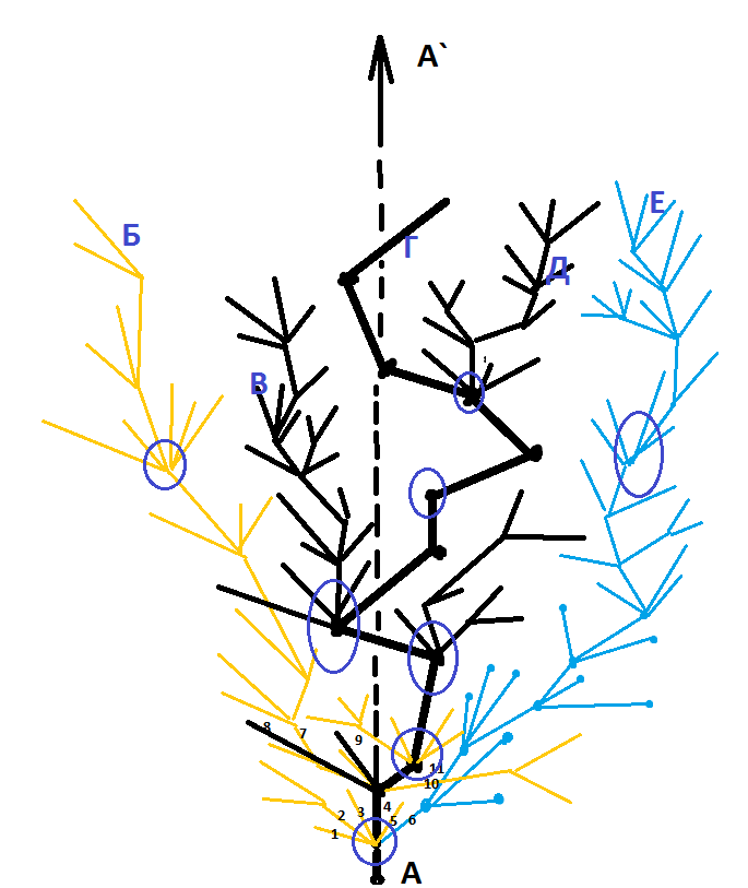 Если взять историческую линию развития человечества, то, согласно этой схеме, мы имеем не реализованные линии Б, В, Д, Е и одну реализованную, на которой мы сейчас и находимся - Г.