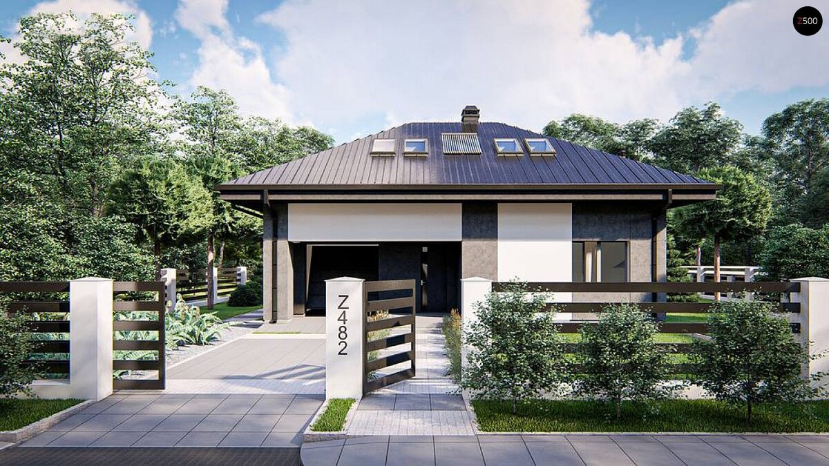 Z482 представляет собой одноэтажный дом с мансардой и гаражом для одного автомобиля. Достоинства проекта Z482: Проект Z482– отличная идея для тех, кто ищет уютный современный дом с привлекательным оригинальным оформлением фасадов. Понравился проект? Пишите комментарии. Посмотреть другие проекты вы можете на сайте.