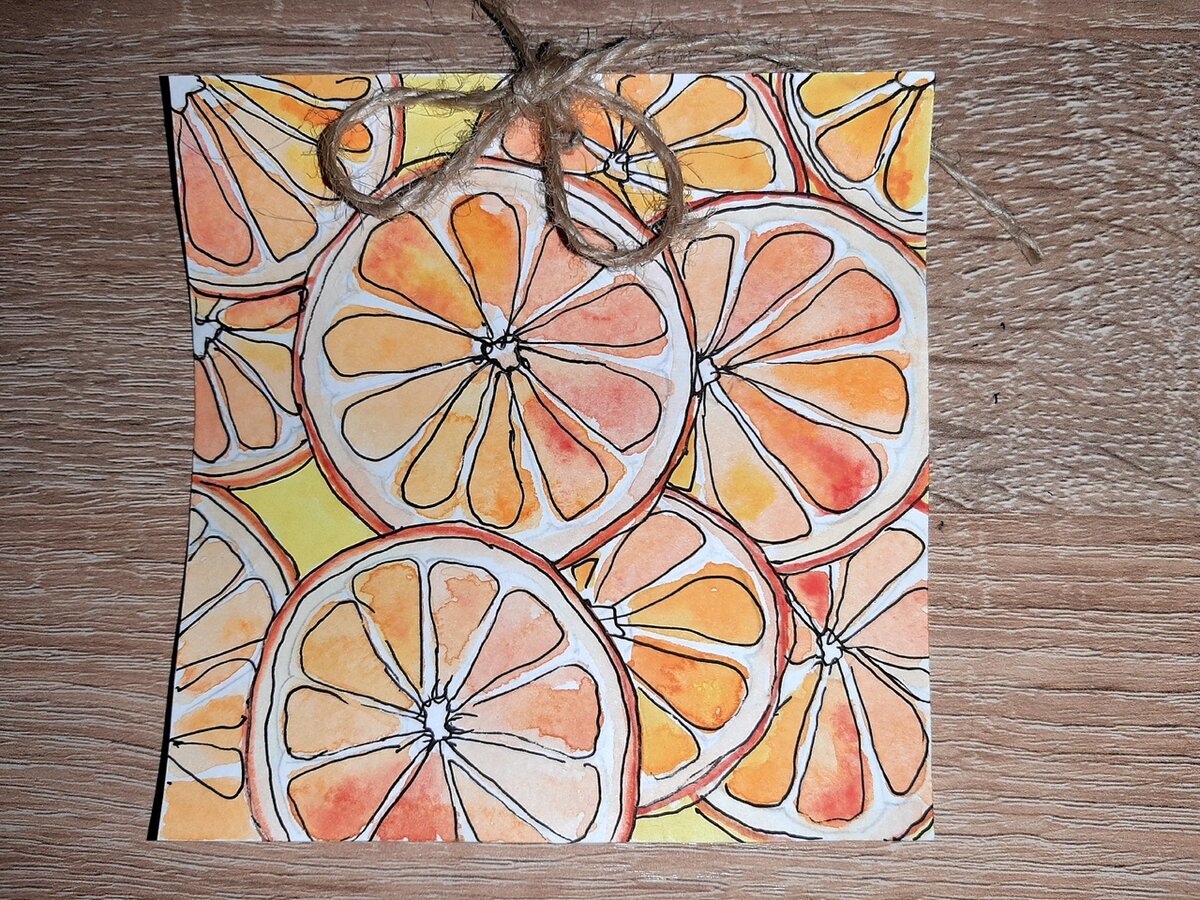 Для открытки нам понадобится: акварель,тонкие кисточки,акварельная бумага,ножницы,черная ручка,бичевка. Первый шаг: намечаем расположение апельсинов. Второй шаг: делаем подмалевки апельсинов и обводим их яркой краской. Третий шаг:ждем пока ваши апельсины высохнут и обводим черной ручкой и приклепляем бичевку. Открытка готова осталось написать ваше поздравление.