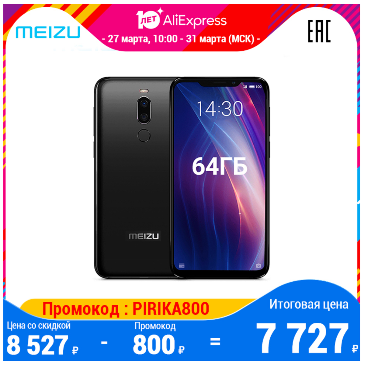 Meizu X8 - это отличный смартфон! Особенно за 7727 рублей. Приобрести его можно на сайте AliExpress. 27.03.2020 10.00 цена на данный смартфон будет составлять 8527. Применив промокод PIRIKA можно скинуть еще 800 рублей .https://clck.ru/Meykw Минимальная цена в рознице Ситилинк - 9990 рублей https://letyshops.com/r/sitilink-cc59479fa044 Процессор Snapdragon 710 позволит вам поиграть в любые современные игры на максимальных-высоких настройках графики с комфортным для игры ФПС. Телефон снабжен достойной камерой, имеет приятный премиальный дизайн.Гениально обыгранная челка ,которую при желании можно скрыть. Из минусов - не самый емкий аккумулятор всего на 3210 мАч, отсутствие NFC модуля и возможные проблемы с прошивкой, обновлениями смартфона. Но все минусы меркнут, ведь цена данного аппарата всего 8000 рублей! Конкурентов с такими характеристиками за такой прайс просто не существует.Если вы мечтали о бюджетном игровом смартфоне - это ваш вариант. Краткие характеристики Meizu X8 Проц