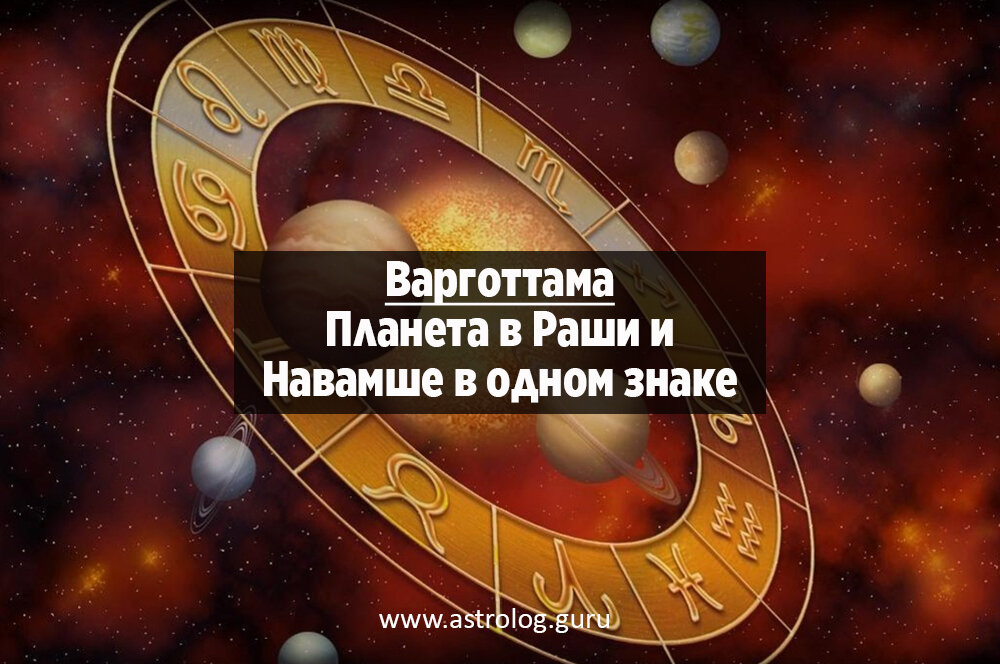 Варготтама – это положение планеты в Раши (карта рождения) и в варгах (дробные карты) в одном и том же знаке зодиака. Наиболее значимо положение планеты в Навамше, потому что эта карта является главной варгой из всех. Положение варготтама похоже по результатам на положение в свакшетре (собственном знаке), то есть усиливает планету и дела домов, которые она занимает. Если эта планета находится в дебилитации (падении), то она принесёт только негативную энергию. Положение планет в варготтаме даёт следующие результаты: • Солнце – ярко выраженные качества лидера, высокий уровень социальной ответственности; • Луна – чувствительность, сострадание, доброта, проницательность; • Марс – практичность, смелость, отвага; • Меркурий – сильный интеллект, успех в научной и преподавательской деятельности; • Юпитер – мудрость, религиозность, способности к передаче высших знаний; • Венера – успех в искусстве и творчестве, чувство прекрасного; • Сатурн – терпение, смирение, трудолюбие, верность; • Атмака