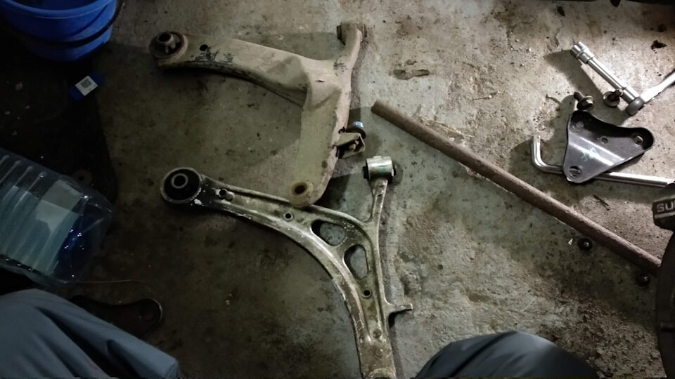 Начинаем замену. Скинул рычаг погнутый. Сравнил с купленным… К слову сказать при ударе погнуло шпильку крепления рычага к кузову. Это на которой крепится задний сайлентблок. Не на много, но видно. И согнуло собственно треугольный кронштейн. Хорошо, что на разборке я догадался купить себе его. Ну и пришлось заказывать эту шпильку. Также пострадала недавно установленная шаровая. Заказал обе новых — поставлю 555. Ну и поменял рулевую тягу. Сначала переживал, что не получится. Но прикупил ключ на 30, на 22 у меня был. И, предварительно открутив выхлоп и немного отодвинув его в сторону, тяга спокойно отвернулась. Немного подогнув обратно шпильку крепления заднего сайлента кувалдометром (аккуратненько, все равно менять), прикрутил на место новую рулевую тягу и рычаг. Вот собственно и все. Стабы и второй рычаг решил пока не менять. Все равно рычаги отворачивать. Один для замены шаровой и установки алюминия, второй для замены шпильки крепления к кузову и замены шаровой. Прикрутил колесо, с