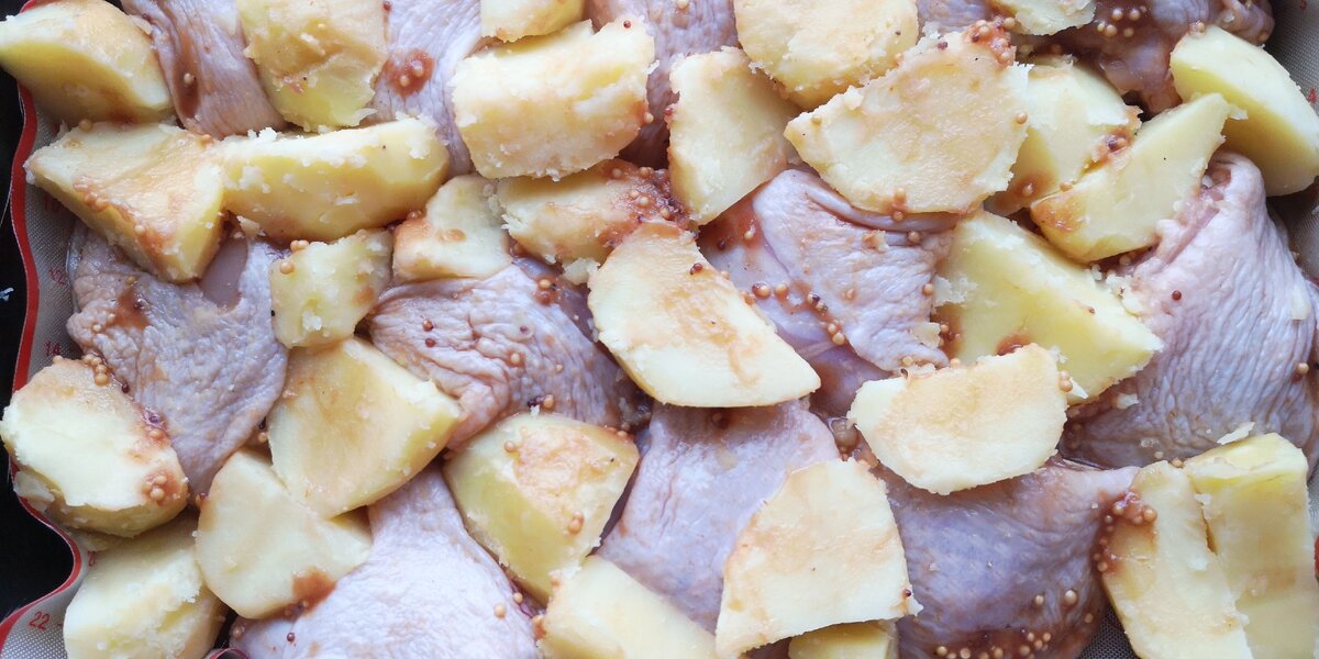 Люблю такие рецепты, в которых готовишь сразу гарнир и мясо одновременно. А главное получается много, очень вкусно и сытно. Картофель и курочка с хрустящей корочкой, а внутри они нежные и сочные. Это действительно очень вкусно. Ингредиенты: Приготовление: 1. Подготовим бёдра. Куриные бёдра промойте, удалите лишний жир и кожу. Смешайте все специи, соль и соевый соус. Погрузите бедра в маринад и хорошо их перемешайте. 2. Займёмся картофелем. Помойте и почистите картофель. Разрежьте его на 4 части. Поставьте варится картофель в подсолённой воде. После закипания варите ещё 15 минут. Слейте полностью воду. Картофель должен быть полусырой. 3. В подготовленный противень для запекания выкладываем маринованные бёдра, сверху картофель. Заливаем остатками маринада и немного смазываем им картофель. 4. В разогретую духовку до 180° отправляем наш противень на 40-45 минут, достаём и смазываем нашу курочку и картофель выделившимся соком. Запекаем ещё 20 минут до румяной корочки. Наша румяная
