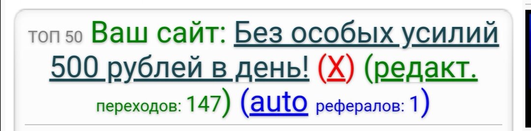 Сегодня я расскажу вам о способе почти пассивного привлечения рефералов, пользоваться мы будем сайтом 1traf Для начала нужно зарегистрироваться и добавить свою ссылку: Так как я уже добавил я могу только отредактировать Затем нужно перейти по 5 ссылкам снизу, и тогда ваш сайт поднимется на 1е место, со временем он будет опускаться, тогда нужно будет переходить еще Есть платные способы поднятия сайта: Авто поднятие каждые 7 минут - 1 поднятие 40 копеек Помещение вашего сайта в вип - 1 минута 10 копеек Гарантированные переходы на ваш сайт - 1000 шт. 40 рублей Вот ссылка: 1traf Заходите и привлекайте рефералов На этом у меня все. Спасибо за то что дочитали статью до конца