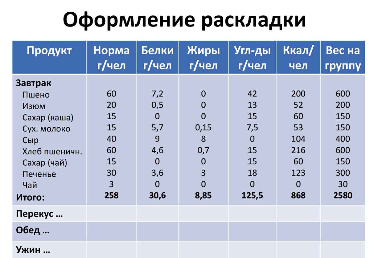 После того, как составили «расписание круп» по дням похода, можно выписывать все продукты в столбик и заносить в компьютер. Первый столбец — продукт, второй — сколько грамм на одного человека на 1 раз, третий — сколько раз вы этот продукт собираетесь есть, четвертый — сколько грамм на всю группу на 1 раз — вычисляется, и в итоге — сколько всего закупать. Можно добавить еще столбик — кто это закупает и берет.