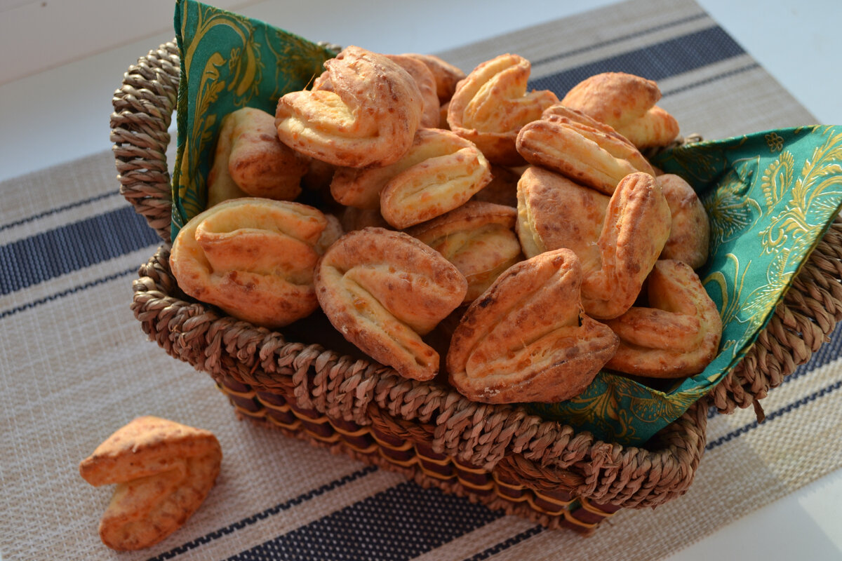 Готовое печенье, достаю из духовки. Форму этим вкуснючим печенюшкам можно придумать любую. Я же готовила по форме гусиных лапок (треугольников).