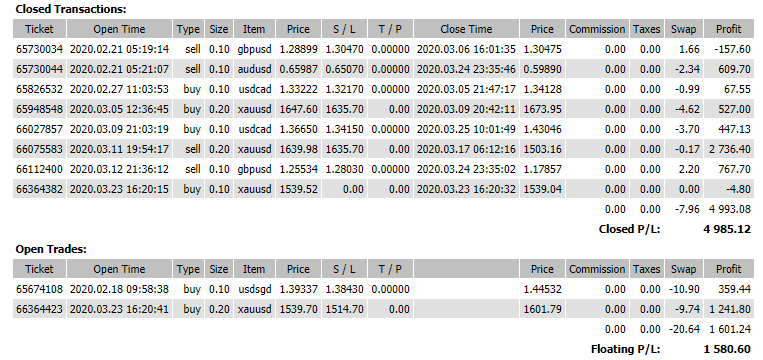 Когда акции падают вместе с бондами, это может означать только одно - инвесторы предпочитают кэш, и от этого доллар растёт даже когда Фед выливает рекордные суммы через Репо и скупку уже почти всех активов. Во время кризиса 2008г Бен Бернанке пообещал, если понадобится сбрасывать деньги с вертолёта, за что на форумах получил тогда прозвище Беня- вертолётчик. Позже план Драги из ЕЦБ назвали денежной базукой. Теперь же ЦБ вливают в разы больше ликвидности, даже не дождавшись действительных отчётов, точно указывающих на рецессию, и имя этому - идеальный шторм. Деньги раздают всем желающим, но доллар продолжает расти. Именно эти процессы мы наблюдаем последние две недели, и лучше всего это отражают валютные рынки. Это хорошо для среднесрочных трендовых стратегий, к которым я отношу и свою "7пар+золото", и после зимней спячки форекс даёт возможность отлично заработать. Так сейчас выглядит мой трейдлист и все закрытые в марте позиции: Собственно, после фиксации хорошей прибыли на трёх валютн