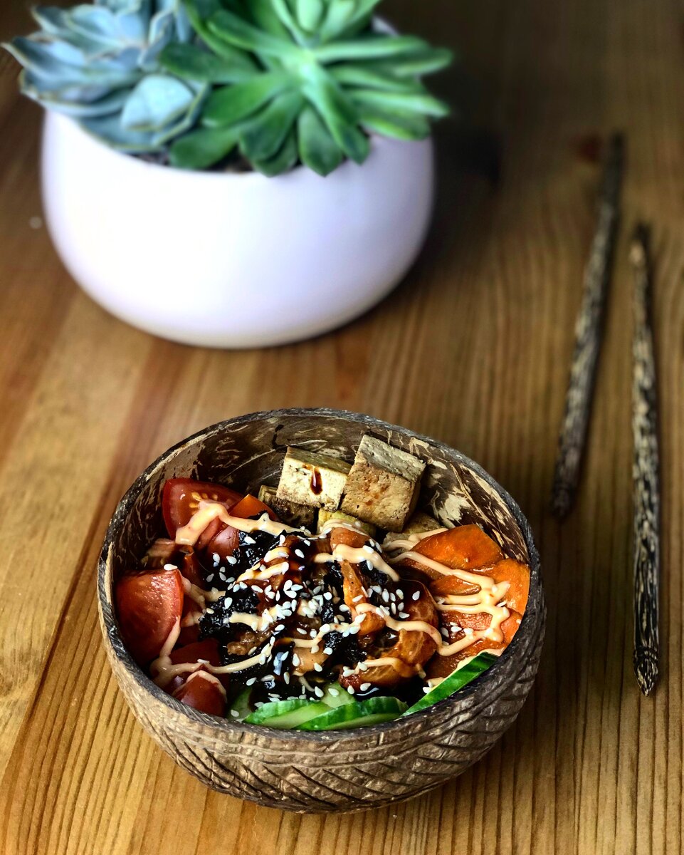 Привет👋🏻 Кто любит роллы? Лично мы обожаем😋Очень нравится сочетание риса и нори, а многообразие возможных начинок дает огромный потенциал для экспериментов. Поке боул - как раз вариант не сложного, но такого же вкусного, как и роллы, блюда🍚Вы можете варьировать ингредиенты по вашему вкусу: вместо веганского тунца можно приготовить имитацию лосося из моркови, добавить маринованный дайкон и даже фрукты. А сегодня мы предлагаем сделать вам Поке боул с имитацией тунца из томатов. Не пугайтесь длинного списка ингредиентов - оно того и стоит. Ну что, приступим? Ингредиенты: Заправка для 100 г риса (отварного) (1 порция): Шрирача-майонез: Маринад для веганского тунца: