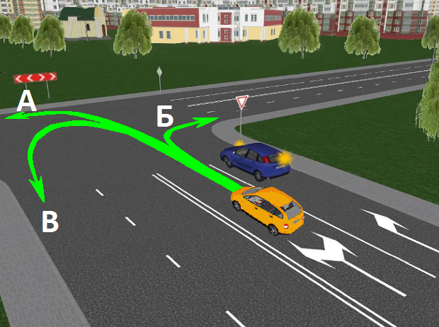 Приветствую на канале, уважаемые подписчики и читатели! Вопрос: В каких из указанных направлений разрешено продолжить движение водителю желтого легкового автомобиля? Варианты ответов: 1) В любом направлении, по всем указанным траекториям. 2) Только налево и направо, по траекториям "А" и "Б". 3) Только налево, по траектории "А". 4) Только налево и в обратном направлении, по траекториям "А" и "В". Проверить свой ответ и сравнить его с правильным Вы сможете в конце статьи. Но не торопитесь в него заглядывать. Сначала очень внимательно посмотрите на схему, вспомните ПДД и хорошо подумайте. Данная задача в основном рассчитана только на тех будущих водителей, которые только начали постигать все премудрости Правил дорожного движения. И пока еще находятся только в самом начале этого не очень легкого, но вполне успешно преодолимого пути. Конкретнее - будущим водителям данная задача довольно хорошо и весьма наглядно помогает лучше понять и крепче усвоить некоторые важные нюансы правил маневриро