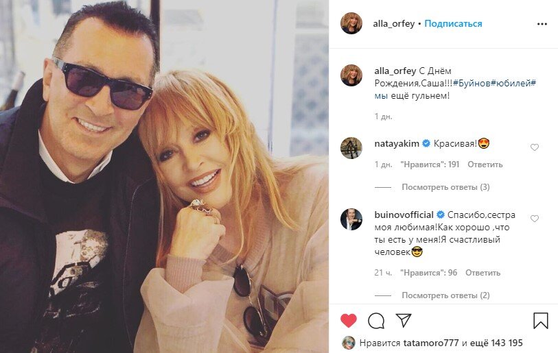 Знаменитая российская певица Алла Пугачева поздравила с юбилеем своего друга и коллегу по музыкальному ЦЕХу Александра Буйнова, которому 24 марта исполнилось 70 лет. "С Днём рождения, Саша!!! Мы еще гульнем!", - написал Примадонна у себя в инстаграме возле фото, на котором она вместе с Буйновым. Пост Аллы Борисовны комментируют подписчики, которые поздравляют Александра Николаевича с юбилеем, желая ему здоровья и всего самого наилучшего! Также многие обращают на то, что Пугачева , которой сейчас тоже 70 лет, и Буйнов очень классно выглядят! Алле Борисовне Пугачевой 15 апреля исполнится 71 год!
